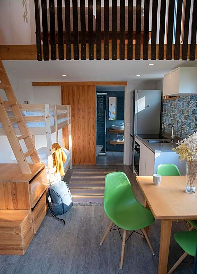This bed in dormitory features a dining area, kitchenette and sofa.
